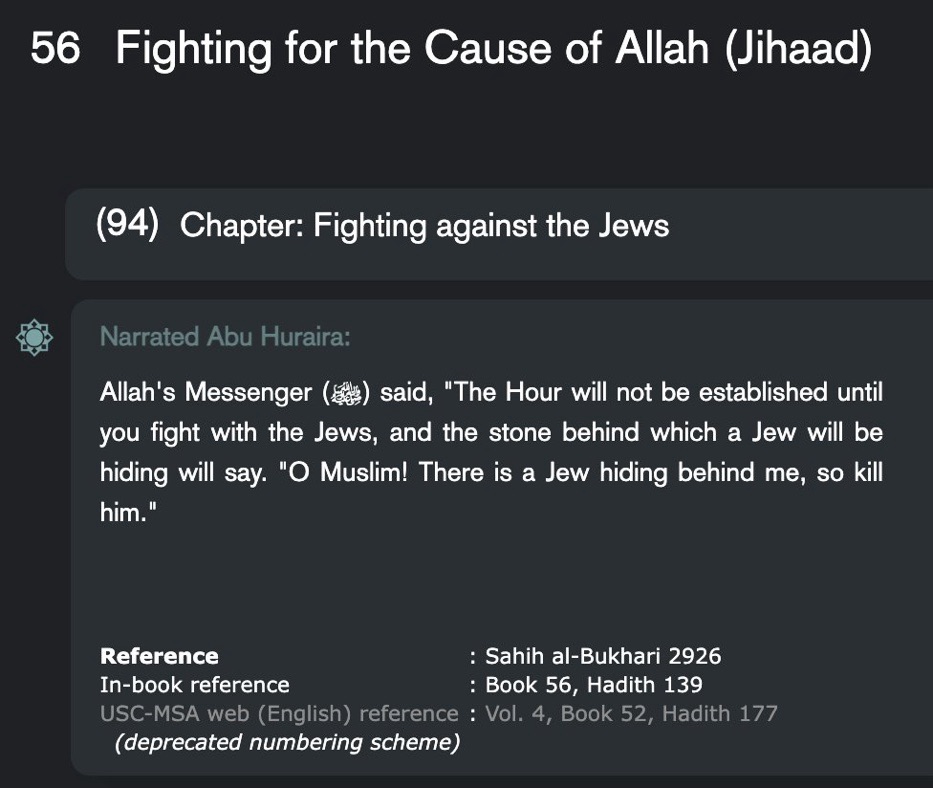 The Hadith in question is not a verse from the Quran but a prophetic narration (Hadith) attributed to the Prophet Muhammad. It appears in multiple authentic collections, including Sahih al-Bukhari and Sahih Muslim. One common version from Sahih al-Bukhari (Book 56, Hadith 139) states: “The Messenger of Allah (peace be upon him) said, ‘The Hour will not be established until you fight with the Jews, and the stone behind which a Jew will be hiding will say, ‘O Muslim! There is a Jew hiding behind me, so kill him.'” 0 A fuller variant from Sahih Muslim (Book 41, Hadith 6985) includes trees and an exception: “The Last Hour would not come unless the Muslims will fight against the Jews and the Muslims would kill them until the Jews would hide themselves behind a stone or a tree and a stone or a tree would say: ‘Muslim, or the servant of Allah, there is a Jew behind me; come and kill him;’ but the tree Gharqad would not say, for it is the tree of the Jews.” 16 24